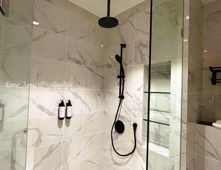 洗面台はコンパクトサイズだけど特に問題はなく、シャワーはハンドとレインの2種類あって便利。